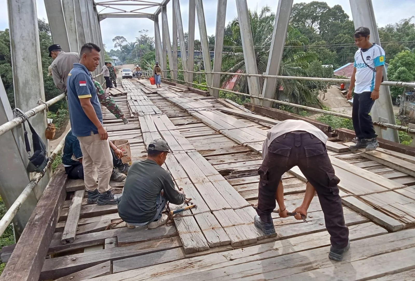 Dukungan material datang dari pihak perusahaan dan pelaku usaha setempat. Perusahaan menyediakan papan jembatan, batu, serta tim infrastruktur, sementara pelaku usaha desa membantu menyediakan paku, rantai bekas yang masih layak pakai, serta kebutuhan konsumsi peserta gotong royong.