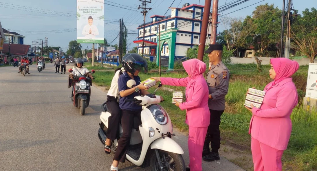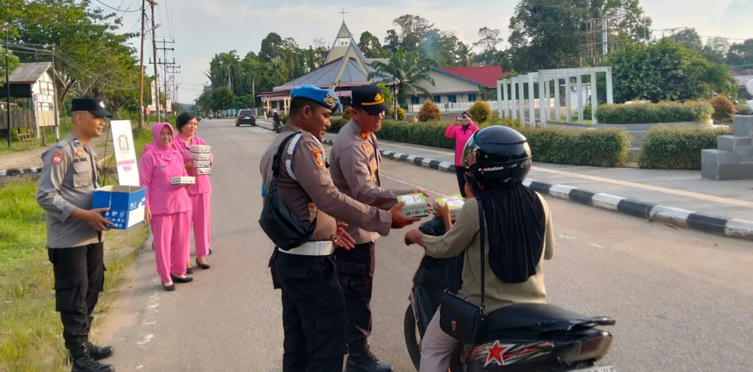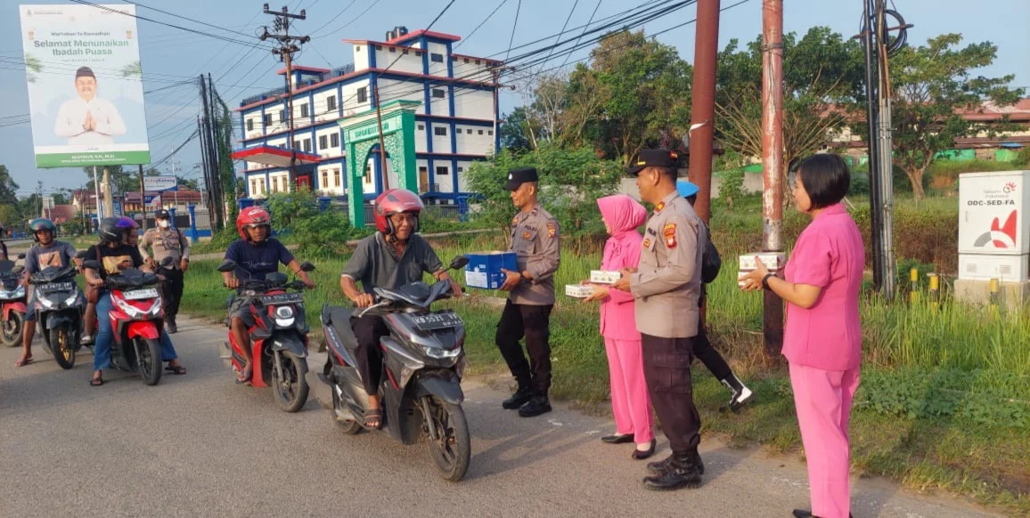 MBN ||SEKADAU, Polda Kalbar – Menjelang waktu berbuka puasa, personel Polsek Sekadau Hilir bersama Bhayangkari turun langsung ke Jalan Merdeka Selatan, Desa Sungai Ringin, Kecamatan Sekadau Hilir, Kabupaten Sekadau, Senin (2/3/2026). Mereka membagikan paket takjil kepada para pengendara yang melintas.