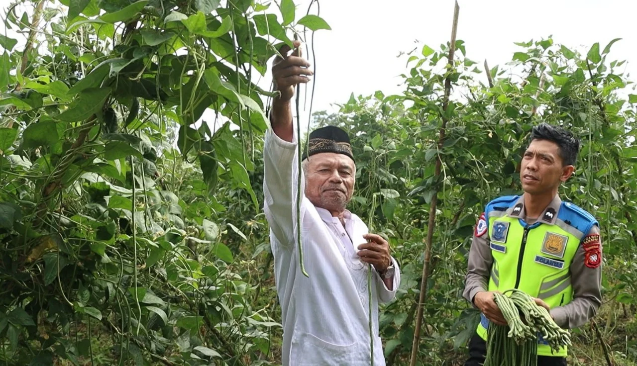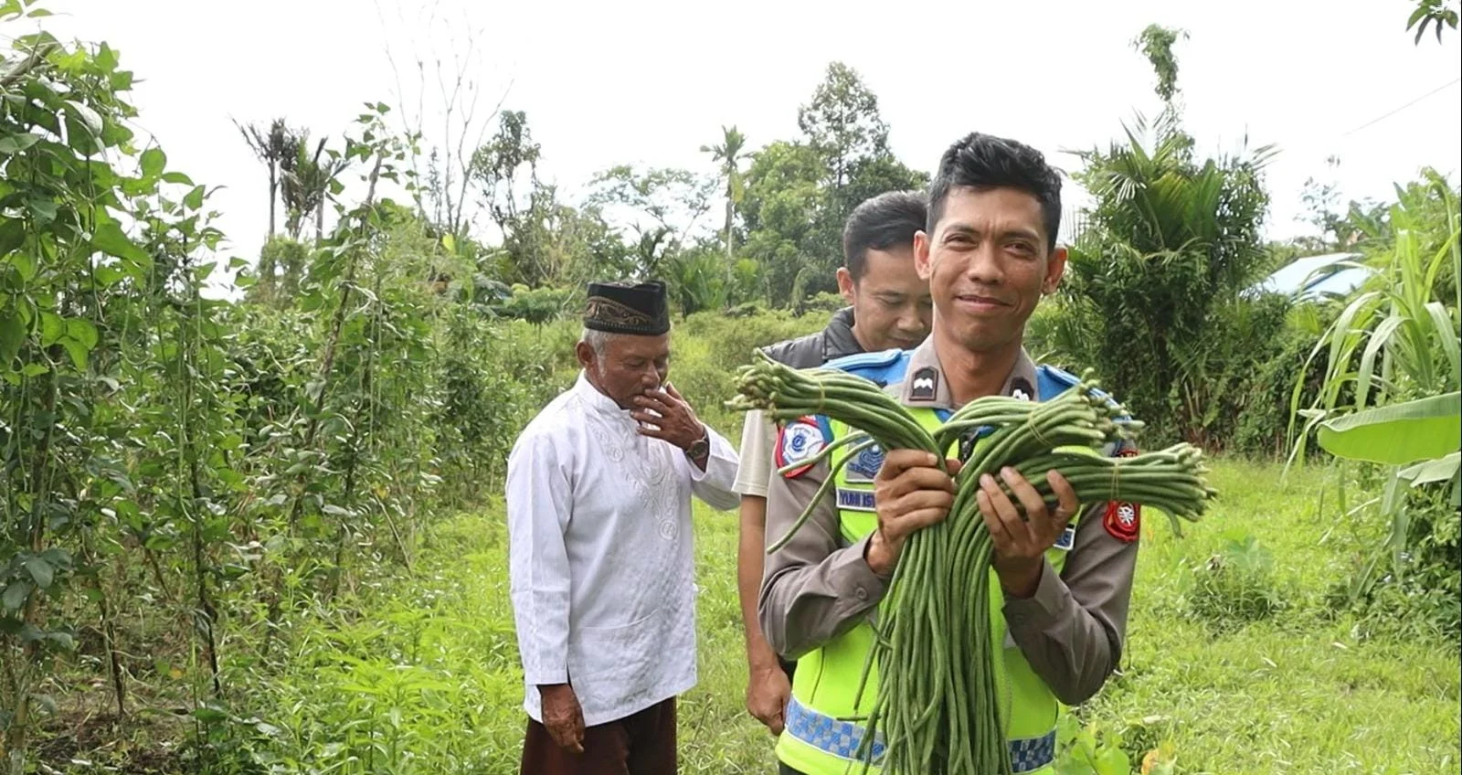 Mbah Kadir menyampaikan terima kasih dan mendoakan kebaikan bagi jajaran Polres Sekadau. Sebagai bentuk apresiasi, ia menyerahkan sayur kacang panjang hasil kebunnya kepada Aipda Yuni.