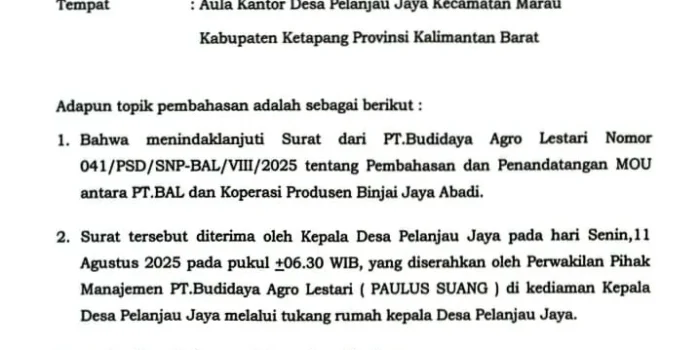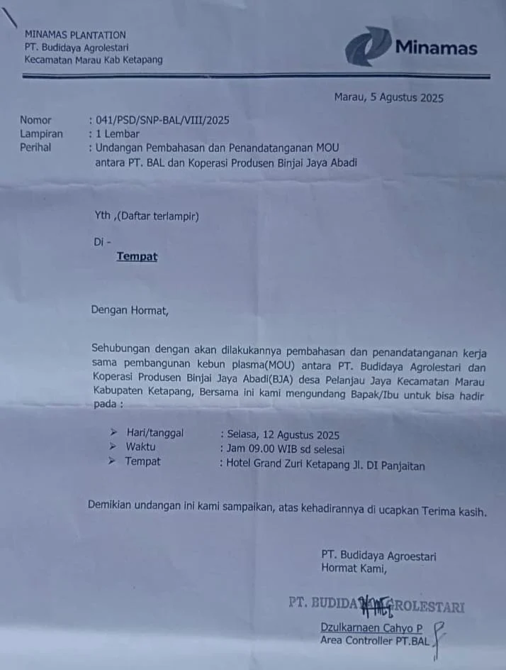 Undangan resmi dari PT. BAL tertanggal 5 Agustus 2025 menyebutkan agenda pembahasan dan penandatanganan MOU pembangunan kebun plasma yang dijadwalkan pada Selasa, 12 Agustus 2025 di Hotel Grand Zuri Ketapang. Dalam surat tersebut, pihak perusahaan turut melampirkan daftar undangan yang melibatkan dinas terkait, pemerintah kecamatan, perangkat desa, pengurus koperasi, dan tokoh masyarakat.