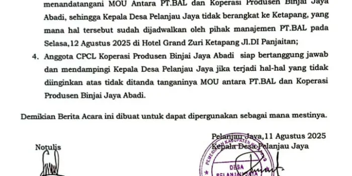Ketapang, 12 Agustus 2025 – Rencana penandatanganan nota kesepahaman (Memorandum of Understanding/MOU) antara PT. Budidaya Agro Lestari (BAL), anak usaha Minamas Plantation, dengan Koperasi Produsen Binjai Jaya Abadi (BJA) berujung batal dihadiri oleh Kepala Desa Pelanjau Jaya. Hal ini menyusul penolakan dari masyarakat anggota Calon Petani Calon Lahan (CPCL) koperasi tersebut.