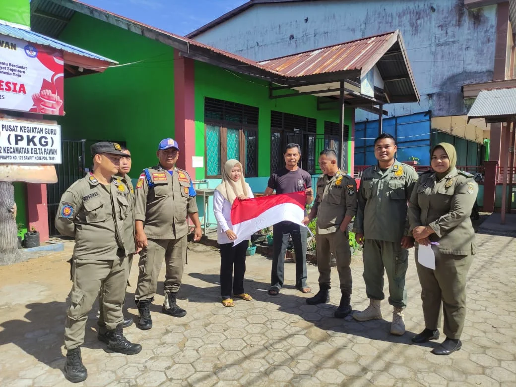 Tak berhenti imbauan, bendera-bendera baru dibagikan langsung ke tangan warga—gratis. Mereka yang benderanya lusuh, termasuk SDN 05 Delta Pawan yang warna benderanya pudar, langsung diganti bendera segar.
