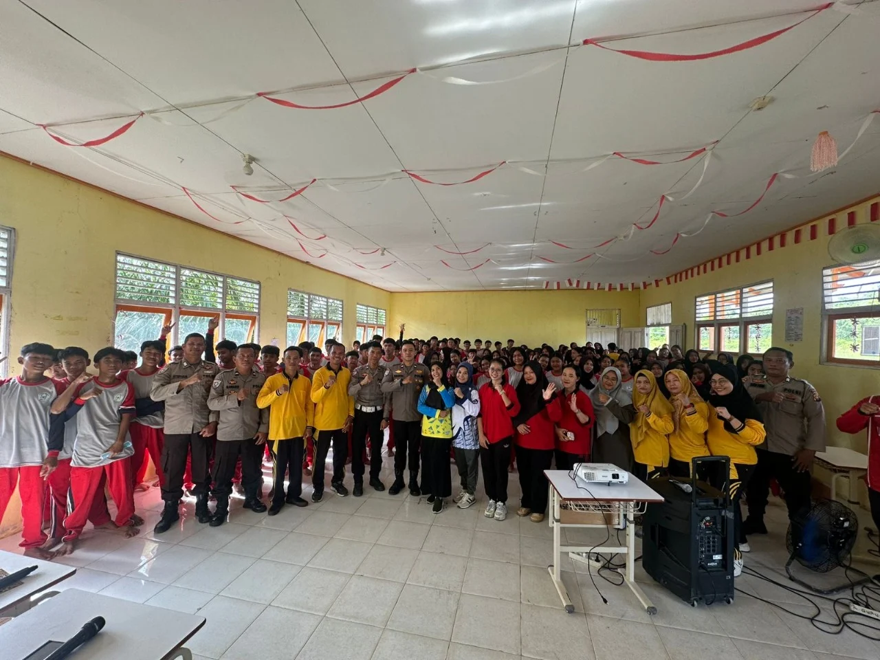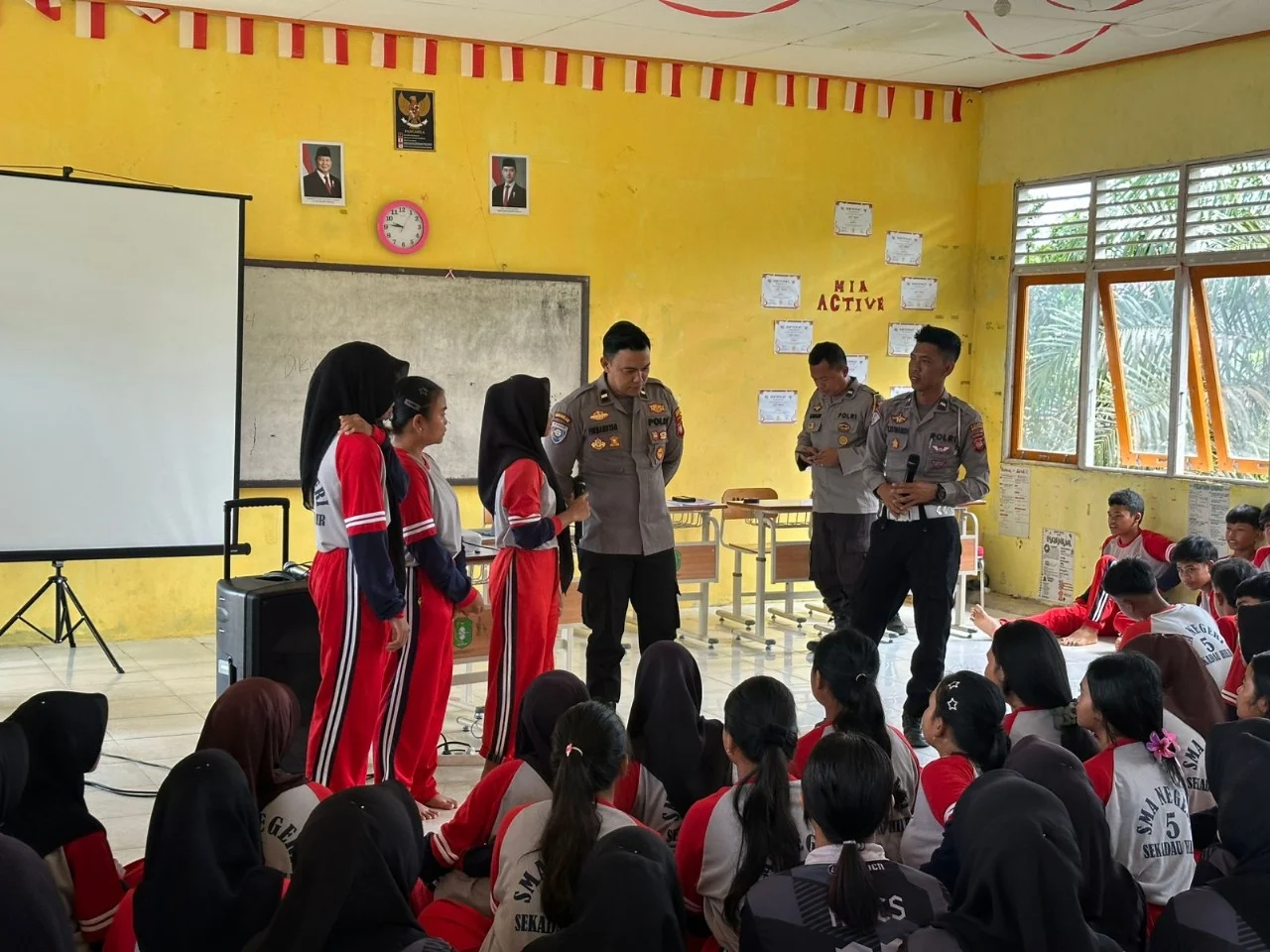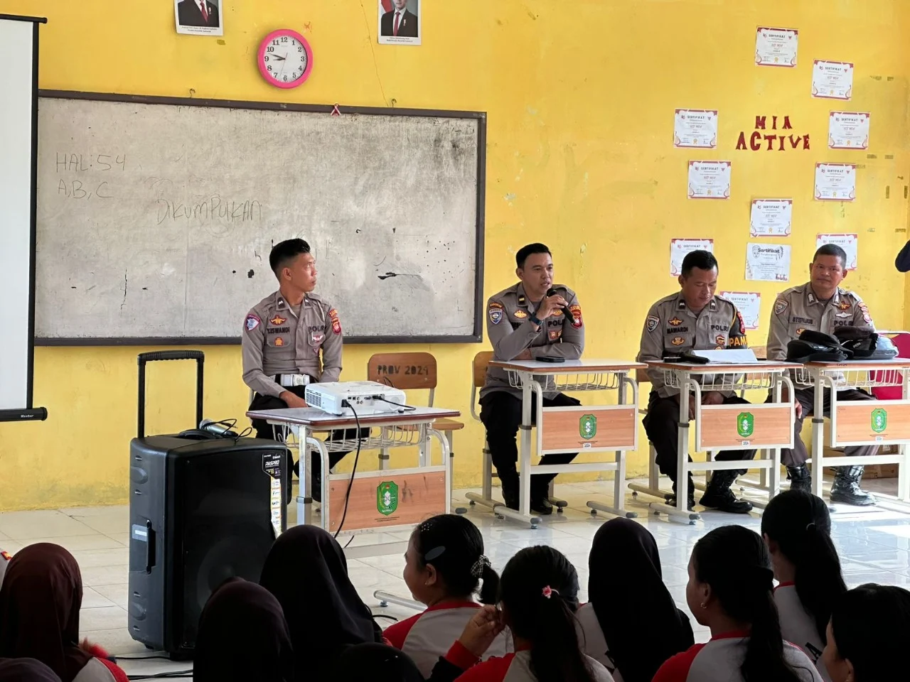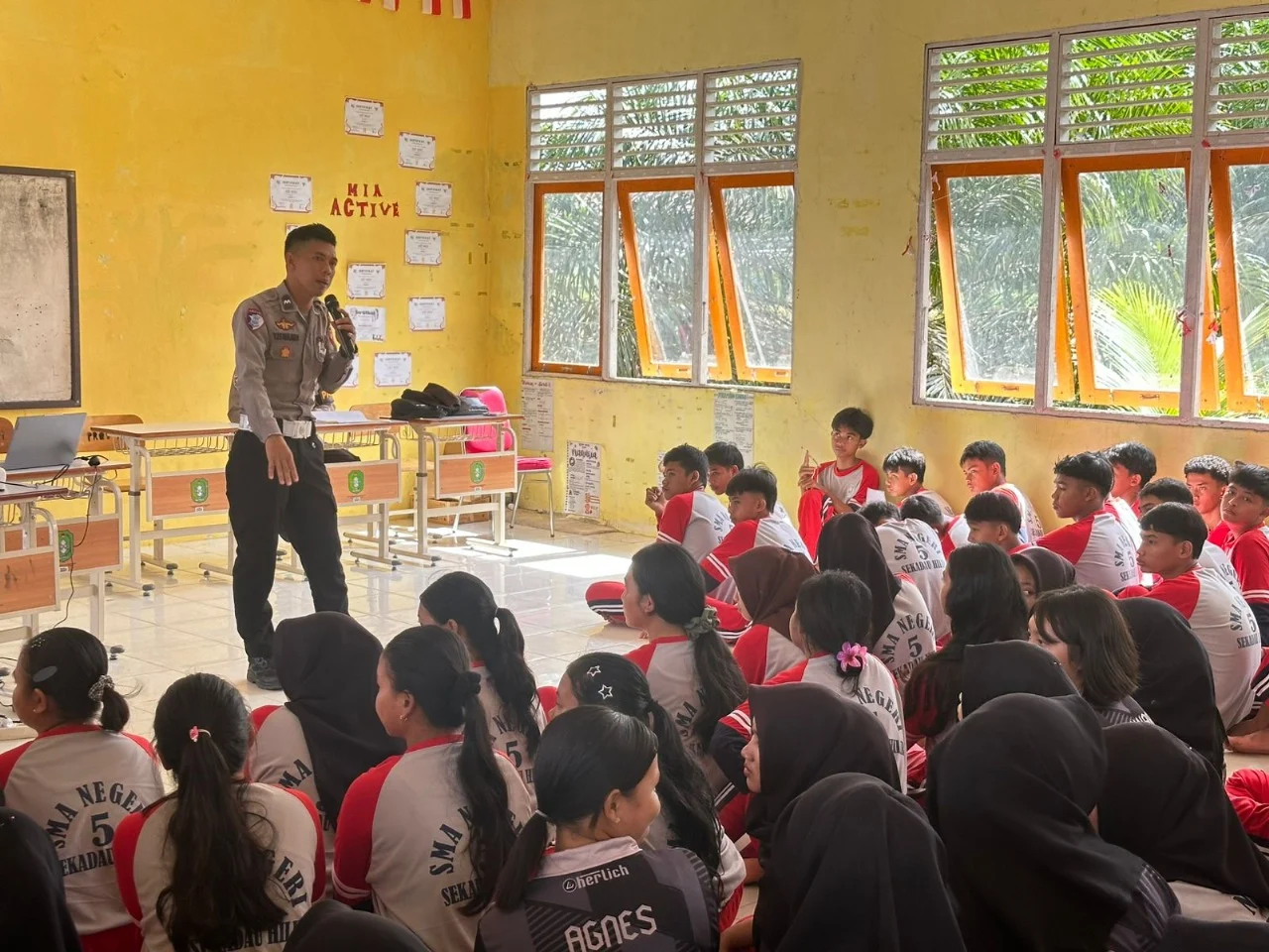 KBO Satbinmas IPDA Firmansyah membuka penyuluhan dengan mengingatkan siswa agar tertib mengikuti kegiatan. Ia menyebut materi yang disampaikan bertujuan membangun kesadaran siswa soal keselamatan, etika pergaulan, dan tanggung jawab sosial.