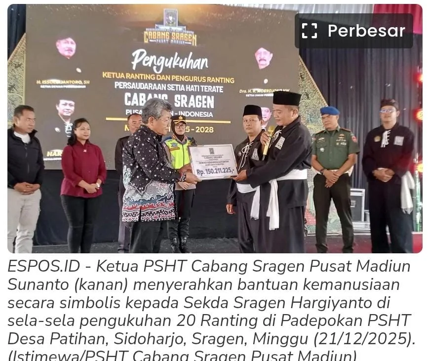 Sragen- ketua PSHT Cabang Sragen Pusat Madiun Sunanto (kanan) menyerahkan bantuan kemanusiaan secara simbolis kepada Sekda Sragen Hargiyanto di sela-sela pengukuhan 20 Ranting di Padepokan PSHT Desa Patihan, Sidoharjo, Sragen, Minggu (21/12/2025). SRAGEN — Sebanyak 20 Ranting Persaudaraan Setia Hati Terate (PSHT) Cabang Sragen Pusat Madiun dari 20 kecamatan di Kabupaten Sragen dikukuhkan secara bersamaan di Padepokan PSHT Desa Patihan, SIdoharjo, Sragen, Minggu (21/12/2025). Sebanyak 600 orang warga PSHT Cabang Sragen Pusat Madiun memadati padepokan.