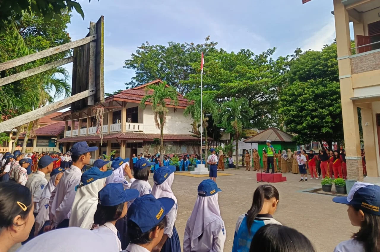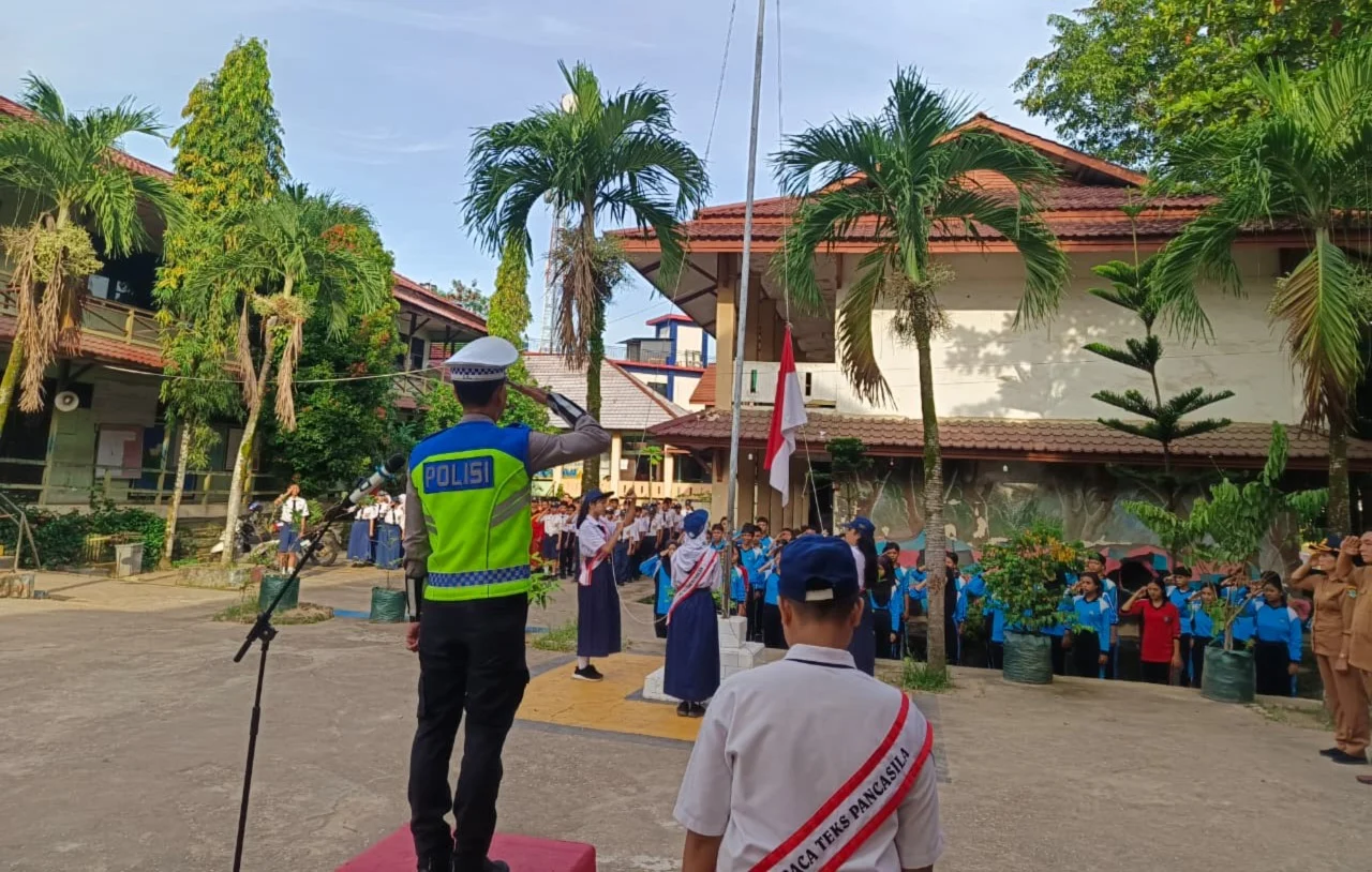MBN ||SEKADAU – Ps. Kanit Kamsel Satlantas Polres Sekadau, Aipda Yuni Iswandi, memberikan edukasi tentang etika berlalu lintas kepada para pelajar saat menjadi Inspektur Upacara di SMPN 1 Sekadau Hilir, Senin (19/1/2026).