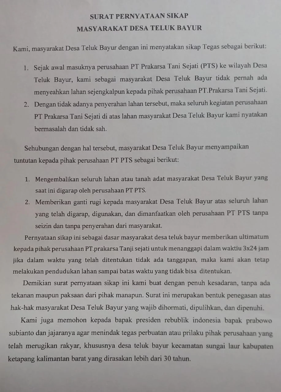 Dalam surat itu, warga menyampaikan bahwa sejak awal kehadiran PT PTS, mereka tidak pernah menyerahkan tanah adat kepada perusahaan. Karena itu, aktivitas perkebunan di atas lahan masyarakat dinilai tidak sah.