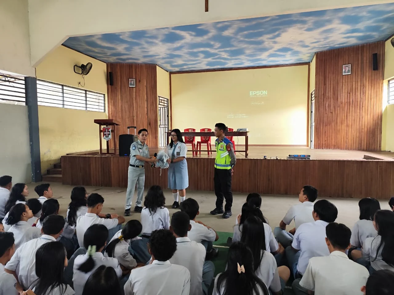 Dalam sesi tanya jawab, perwakilan Jasa Raharja Sekadau, M. Iqbal, membagikan helm berstandar SNI kepada siswa yang mampu menjawab pertanyaan. Edukasi dikemas interaktif agar pesan keselamatan lebih mudah dipahami.