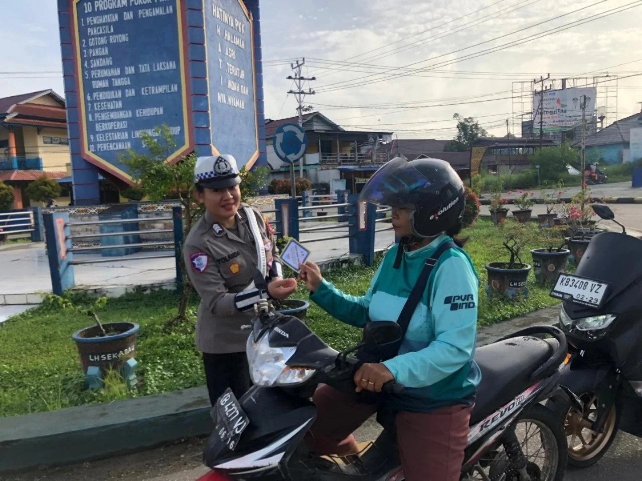 MBN ||SEKADAU – Personel Satuan Lalu Lintas Polres Sekadau yang tergabung dalam Satgas Operasi Zebra Kapuas 2025 membagikan brosur dan stiker imbauan keselamatan kepada pengguna jalan saat penertiban kendaraan di wilayah Sekadau, Jumat (28/11).