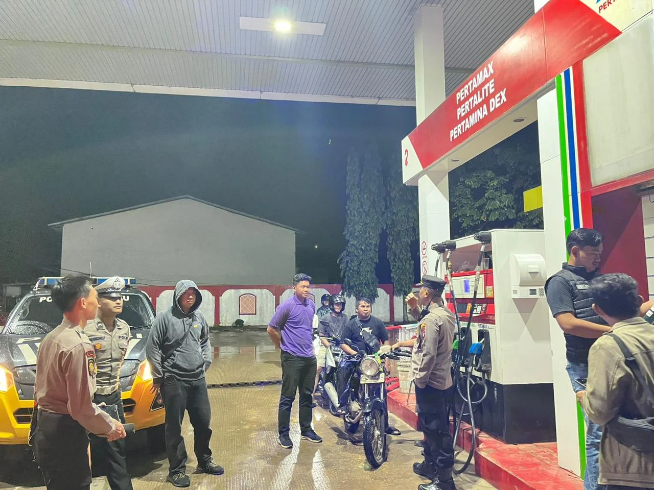 Tidak hanya pasar, petugas juga singgah di stasiun pengisian bahan bakar umum (SPBU). Di lokasi ini, anggota berdialog dengan pengendara motor yang sedang mengisi bahan bakar. Selain memastikan keamanan, petugas juga mengingatkan warga untuk selalu tertib dan berhati-hati di jalan.