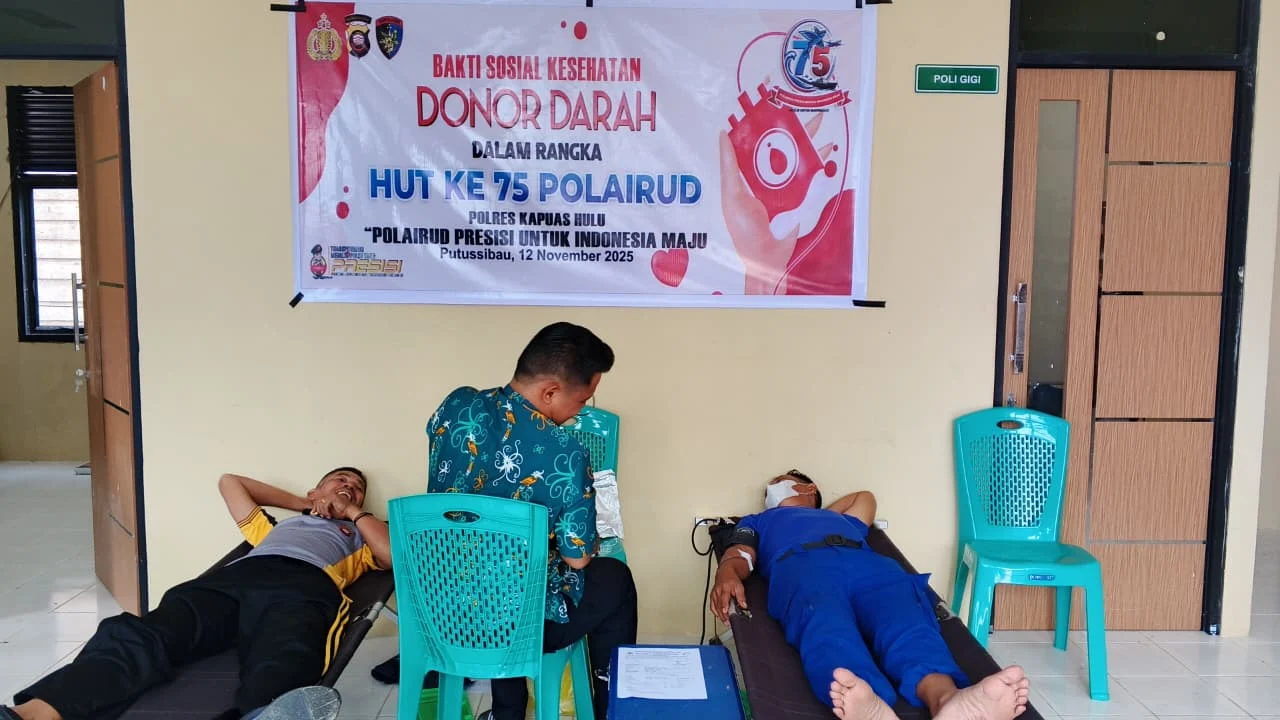 MBN ||KAPUAS HULU – Dalam rangka memperingati Hari Ulang Tahun Kepolisian Perairan dan Udara (Polairud) Polri ke-75, Polres Kapuas Hulu melaksanakan kegiatan bakti kesehatan donor darah pada Jumat (14/11/25). Kegiatan kemanusiaan tersebut berlangsung di Klinik Pratama Polres Kapuas Hulu mulai pukul 08.00 WIB.