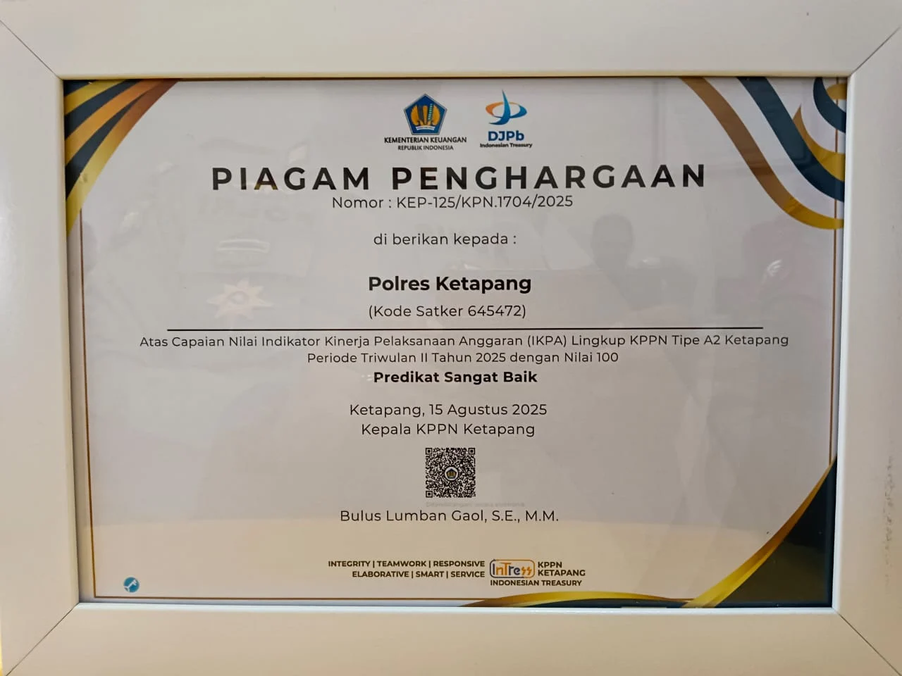 MBN ||KETAPANG – Kepolisian Resor Ketapang menerima piagam penghargaan dengan predikat “Sangat Baik” atas capaian nilai indikator kinerja pelaksanaan anggaran (IKPA) lingkup KPPN Tipe A2 Ketapang periode triwulan II Tahun 2025 dengan nilai sempurna 100.