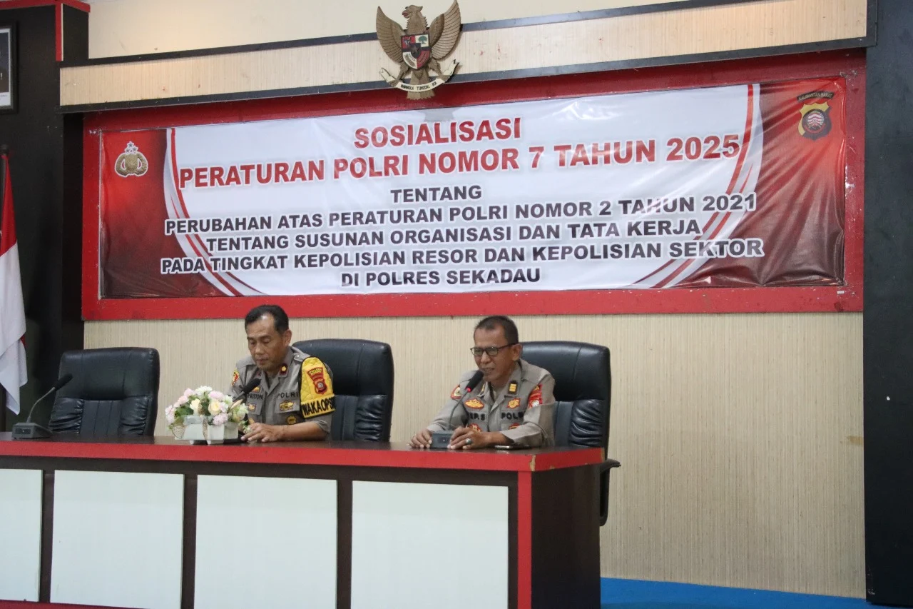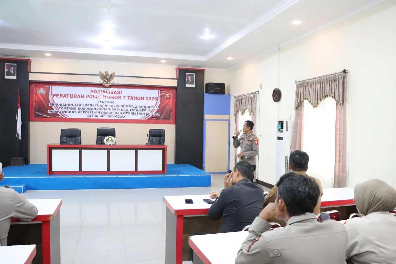MBN ||SEKADAU – Polres Sekadau melalui Bagian Sumber Daya Manusia (SDM) melaksanakan sosialisasi Peraturan Polri Nomor 7 Tahun 2025 yang merupakan perubahan atas Perpol Nomor 2 Tahun 2021 mengenai Struktur Organisasi dan Tata Kerja (SOTK) pada tingkat Polres dan Polsek. Kegiatan berlangsung di Aula Bhayangkara Patriatama Polres Sekadau, Kamis (20/11/2025).