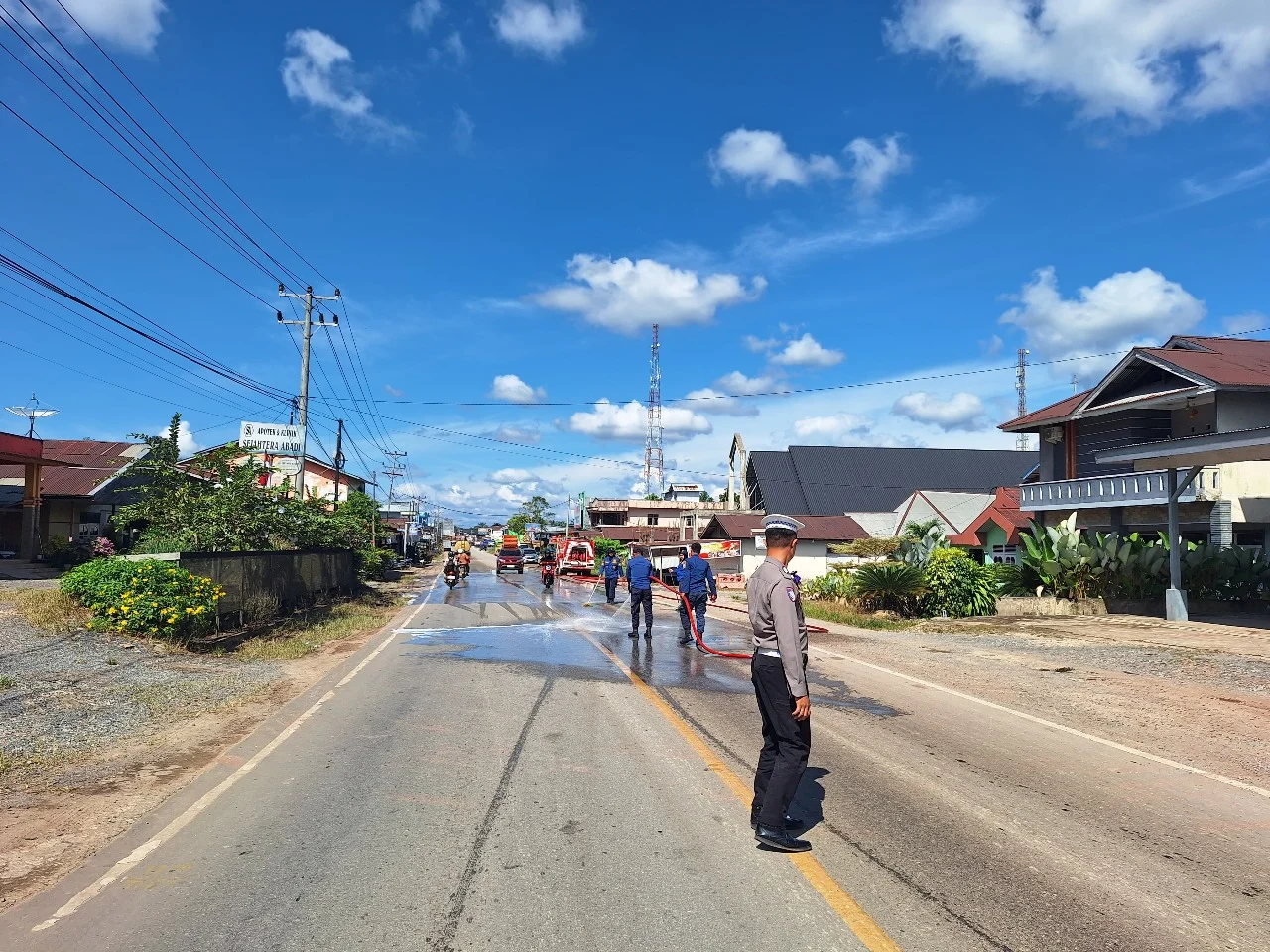 Tumpahan solar tersebut diketahui terjadi sekitar pukul 14.00 WIB, tidak jauh dari Pospol. Material tumpahan membuat permukaan jalan menjadi licin dan berpotensi membahayakan pengguna jalan, terutama pengendara roda dua.