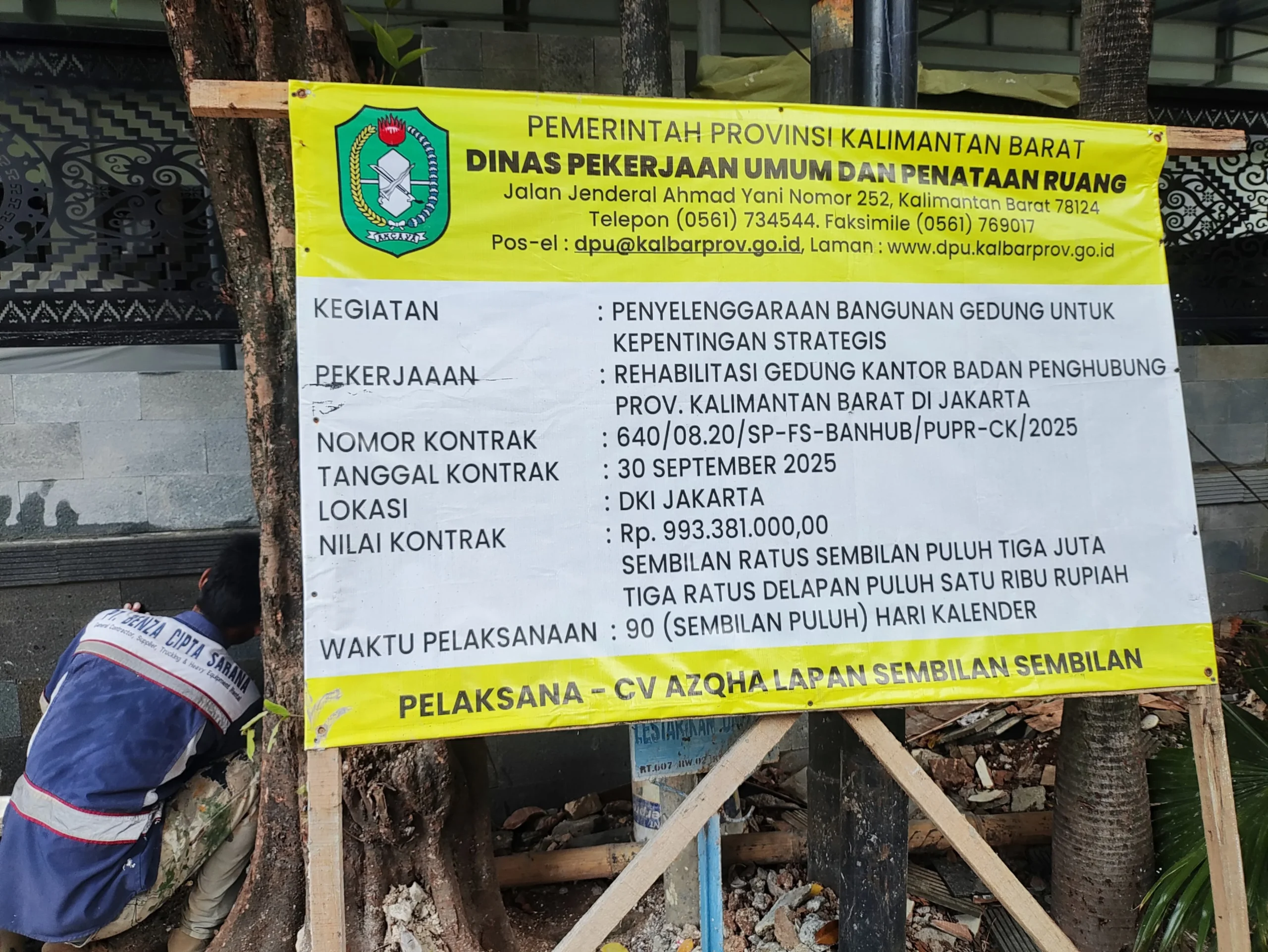 JAKARTA – Tim media meninjau langsung pekerjaan rehabilitasi Gedung Kantor Badan Perhubungan Provinsi Kalimantan Barat di Jakarta pada Rabu (03/12/2025). Proyek yang tercantum dalam papan informasi dengan judul “Rehabilitasi Gedung Kantor Badan Perhubungan Provinsi Kalimantan Barat di Jakarta” ini memiliki nilai kontrak mencapai Rp 993.381.000, dan dikerjakan oleh CV Azqha Lapan Sembilan Sembilan dengan waktu pelaksanaan 90 hari kalender.