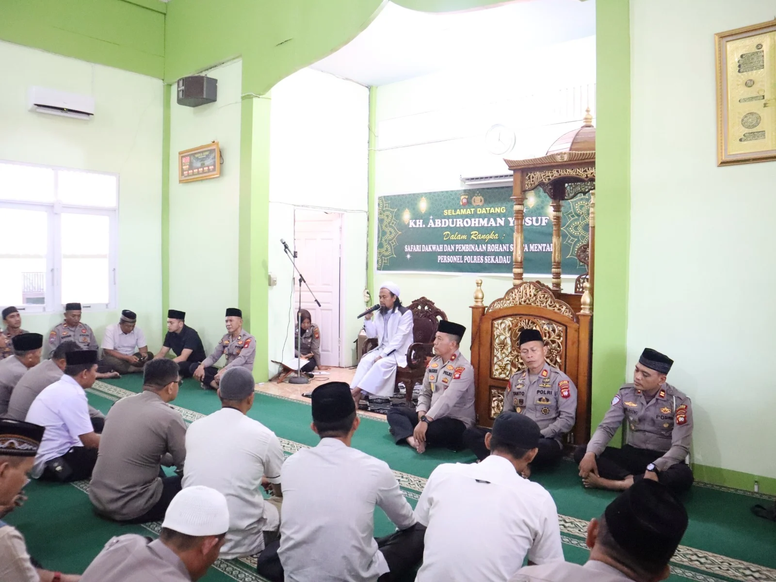 Dalam tausiahnya, KH. Abdurohman Yusuf mengingatkan pentingnya menjaga keimanan dan integritas dalam menjalankan tugas. Ia menyampaikan bahwa tugas kepolisian merupakan bentuk pengabdian yang bernilai ibadah apabila dilandasi niat tulus dan tanggung jawab moral.