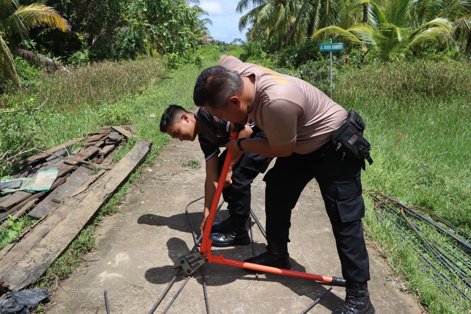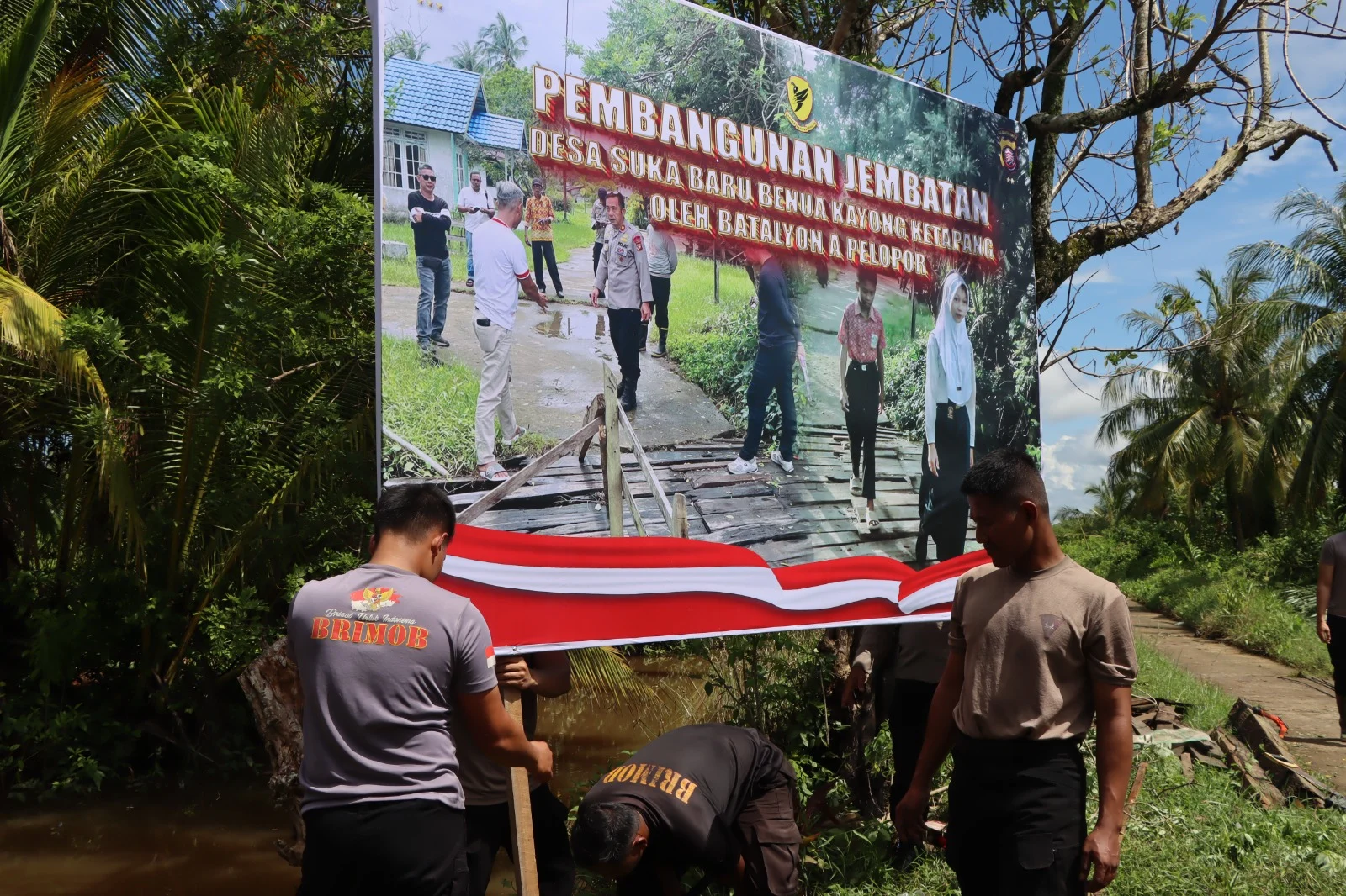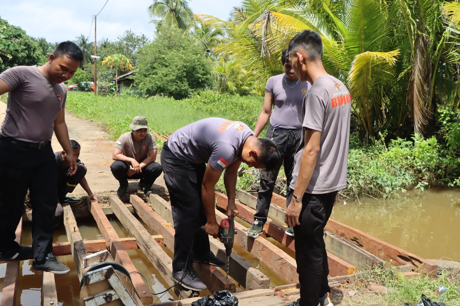 Personel kepolisian bersama Kompi Brimob Ketapang dan masyarakat bahu-membahu melakukan pekerjaan mulai dari pembongkaran bagian jembatan yang rusak, pemasangan material baru, hingga perataan dan penguatan konstruksi jembatan. Kebersamaan dan semangat gotong royong terlihat jelas selama kegiatan berlangsung.