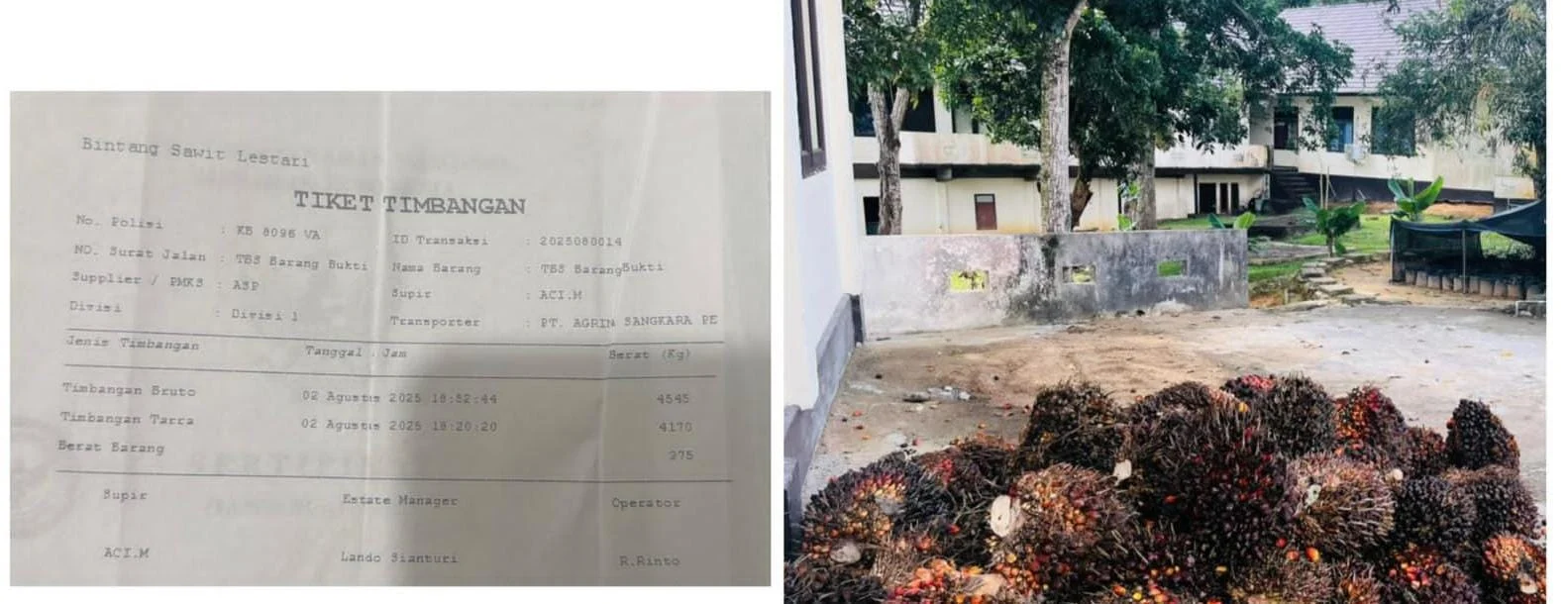 Dua petugas keamanan perusahaan, menemukan mobil Toyota Calya berwarna cokelat metalik terperosok di parit, pintu belakang terbuka, dan berisi puluhan tandan buah segar (TBS).