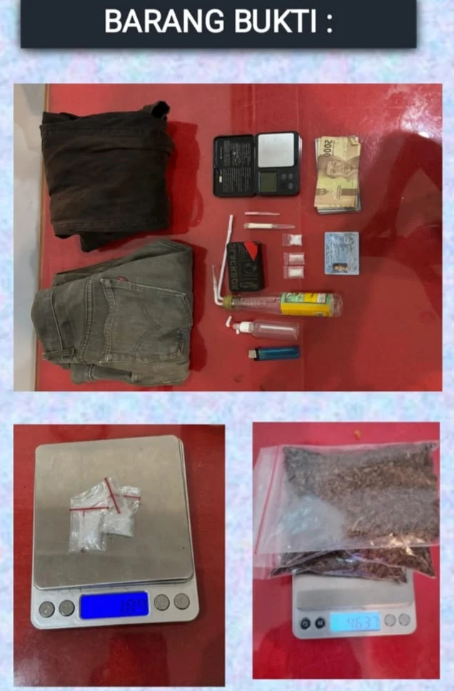 Terduga pelaku berinisial D (55) diamankan di rumahnya setelah petugas menerima informasi bahwa rumah pelaku sering dijadikan lokasi transaksi narkoba. Saat petugas mengamankan pelaku yang disaksikan perangkat warga setempat, petugas juga menyita dari tangan pelaku sejumlah barang bukti berupa 3 kantong klip transparan ukuran kecil berisi serbuk kristal diduga narkotika jenis sabu dengan berat 1,89 gram Brutto, 3 kantong plastik tembakau diduga ganja kering dengan berat 46,37 gram Brutto, 1 buah timbangan digital, 2 buah pipet modifikasi sendok sabu, 2 buah alat hisap sabu atau bong dan 1 buah korek api.