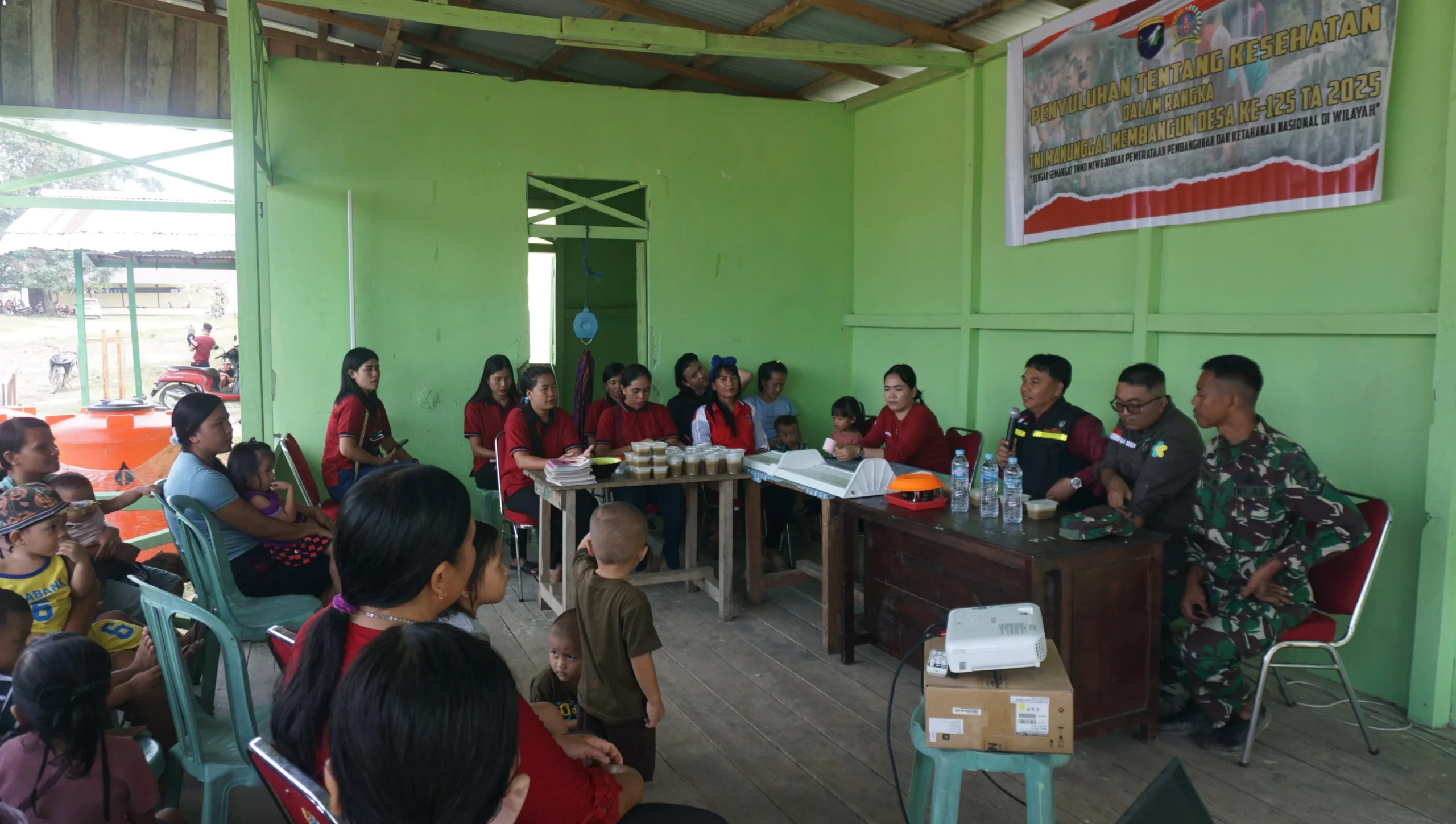 MBN ||Sintang – Antusiasme warga tampak memenuhi balai desa saat penyuluhan kesehatan dalam rangka TNI Manunggal Membangun Desa (TMMD) ke-125 Kodim 1205/Sintang digelar, Minggu (10/8/2025).