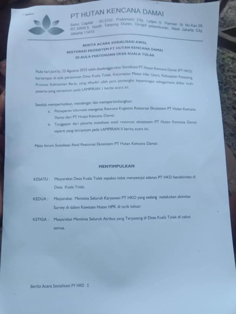 Ketapang ~ Rencana aktivitas PT Hutan Kencana Damai (HKD) di wilayah Desa Kuala Tolak, Kecamatan Matan Hilir Utara, Kabupaten Ketapang mendapat penolakan tegas dari masyarakat. Hal tersebut tertuang dalam berita acara hasil sosialisasi awal yang digelar bersama pemerintah desa, camat, tokoh masyarakat, serta perwakilan perusahaan.