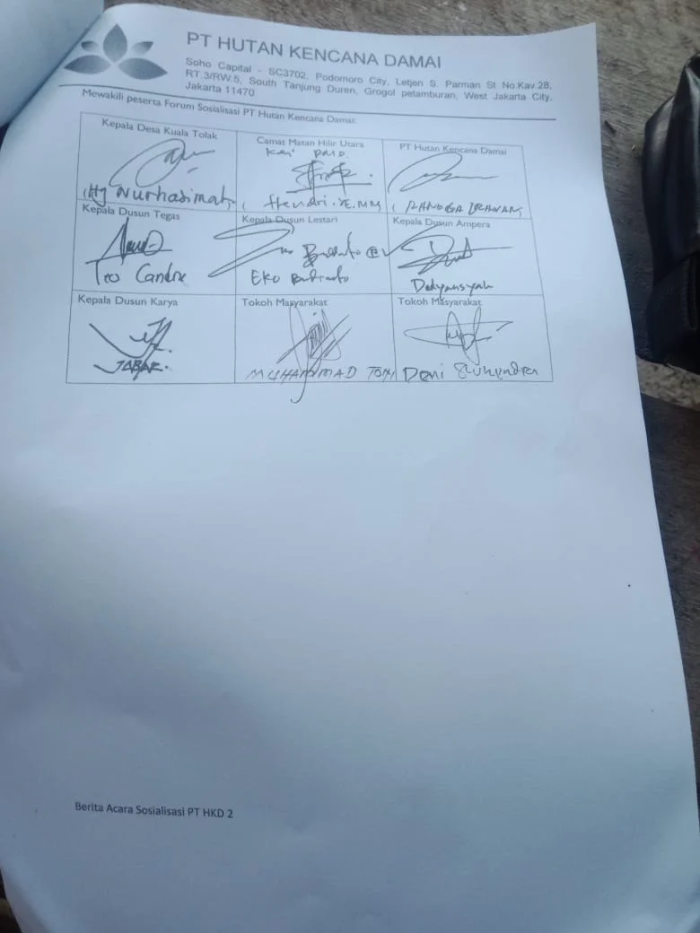Berita acara penolakan ini ditandatangani langsung oleh Kepala Desa Kuala Tolak, Camat Matan Hilir Utara, para kepala dusun, tokoh masyarakat, serta perwakilan PT HKD yang hadir dalam pertemuan.
